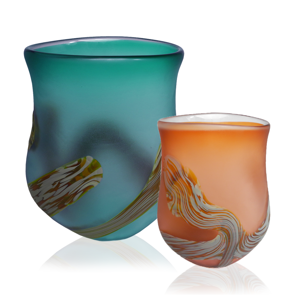 He is continually drawn to the optical qualities of the glass when engraving, and at the same time obscuring parts of the surface. Mischka begins by blowing out large vessels in the hot shop, after the piece is shaped he re-heats the form and stretches out the shape so each vase is one-of-a-kind. He enjoys how each end result is different.