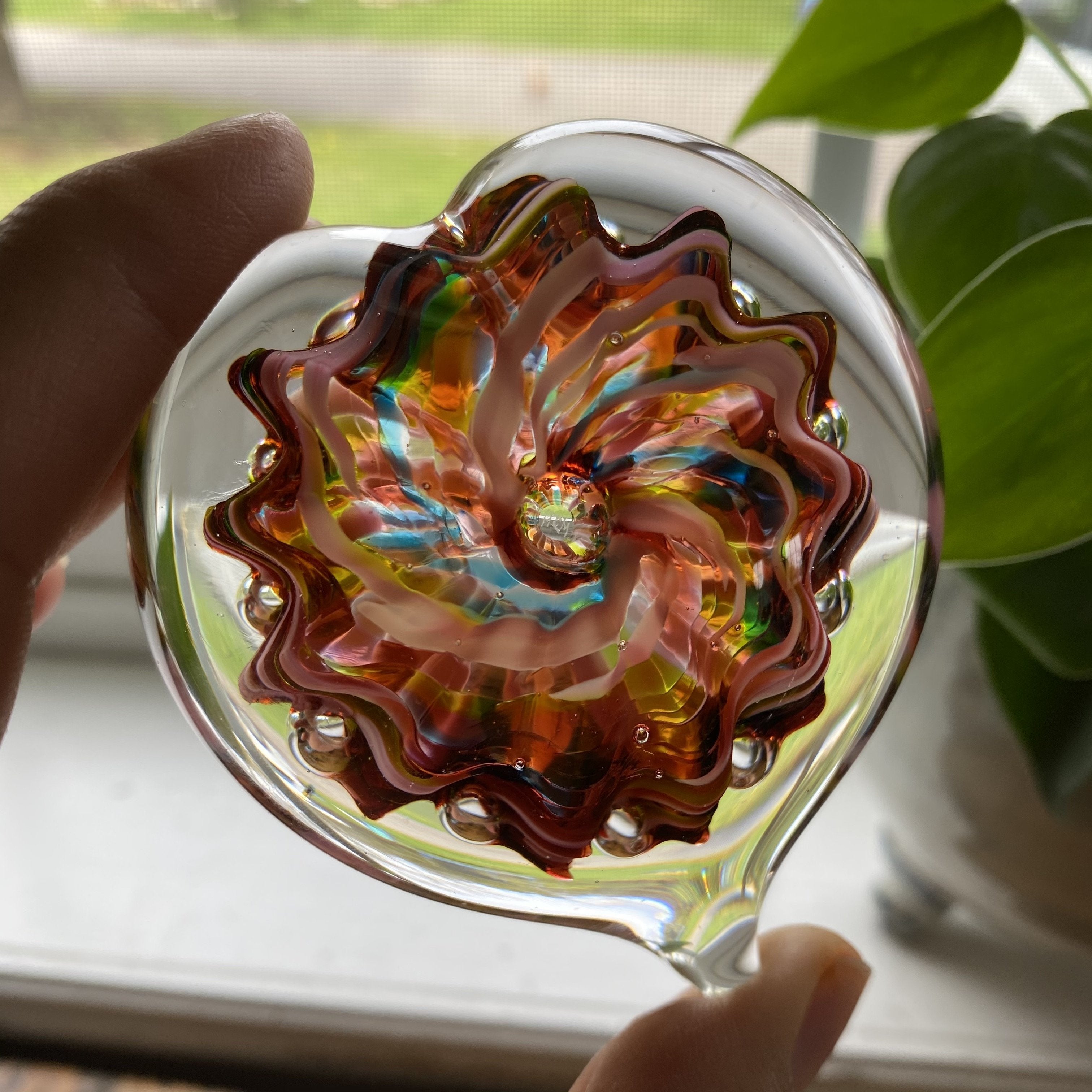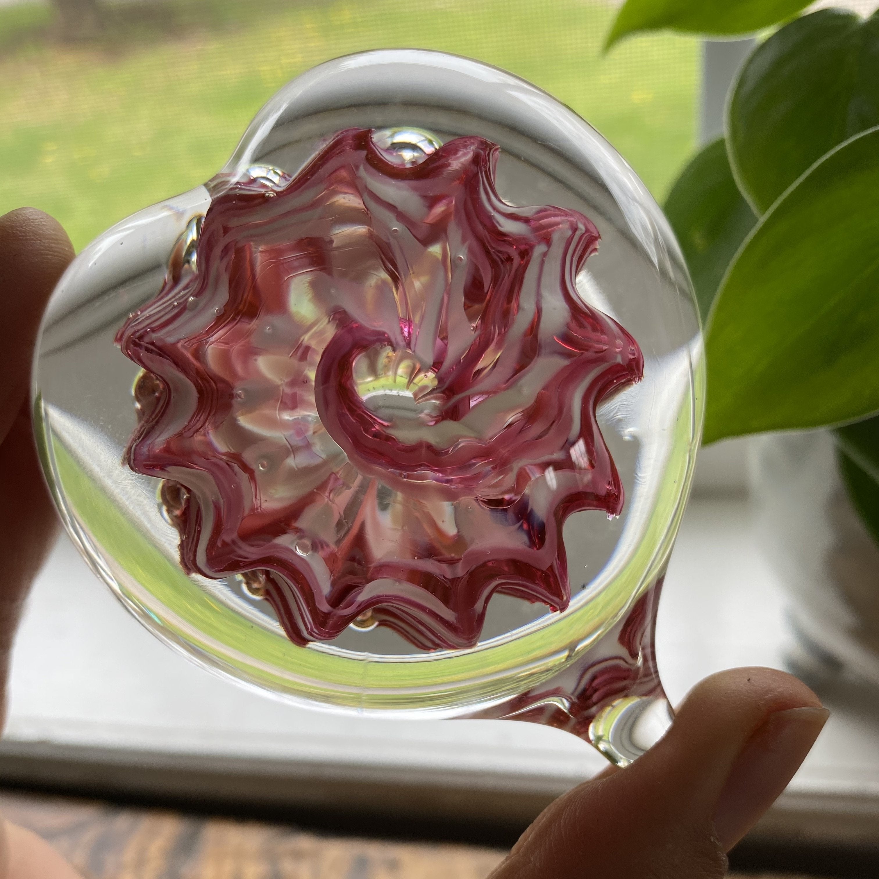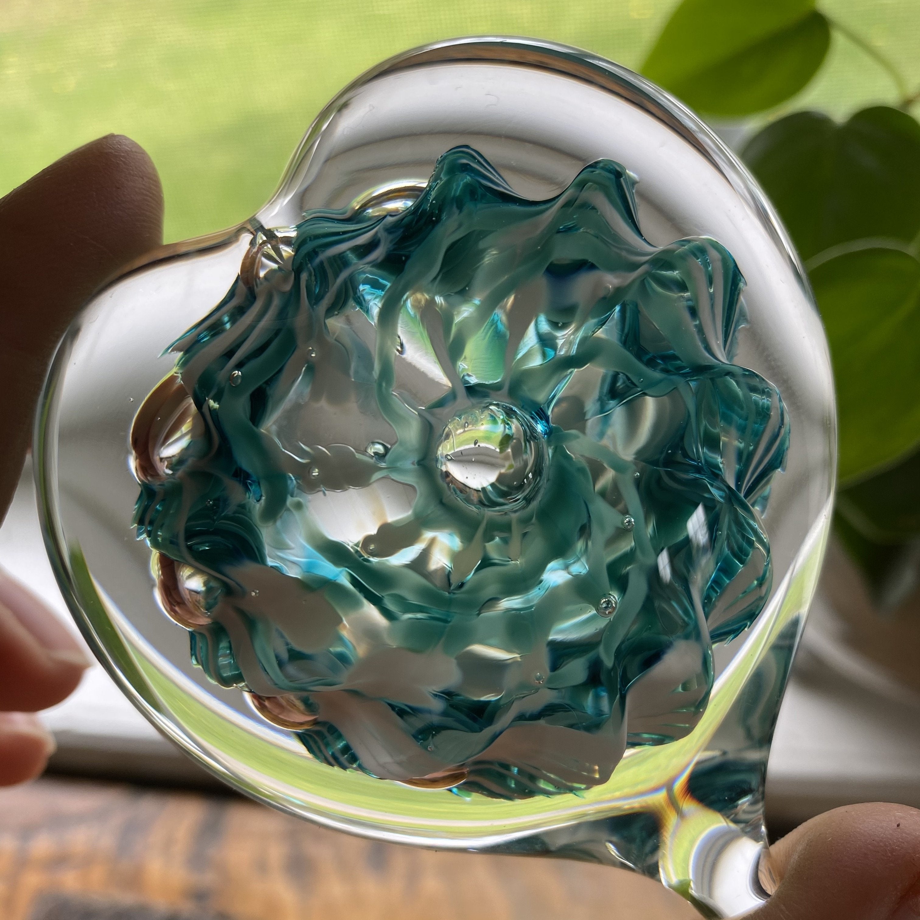 Each of these vibrant, solid glass hearts features a carefully sculpted interior design, skillfully crafted by Alexi. At the center of every heart, a perfectly placed bubble is captured, adding a unique and mesmerizing detail. Available in a beautiful assortment of bright colours, these handmade pieces are a stunning display of craftsmanship and creativity.