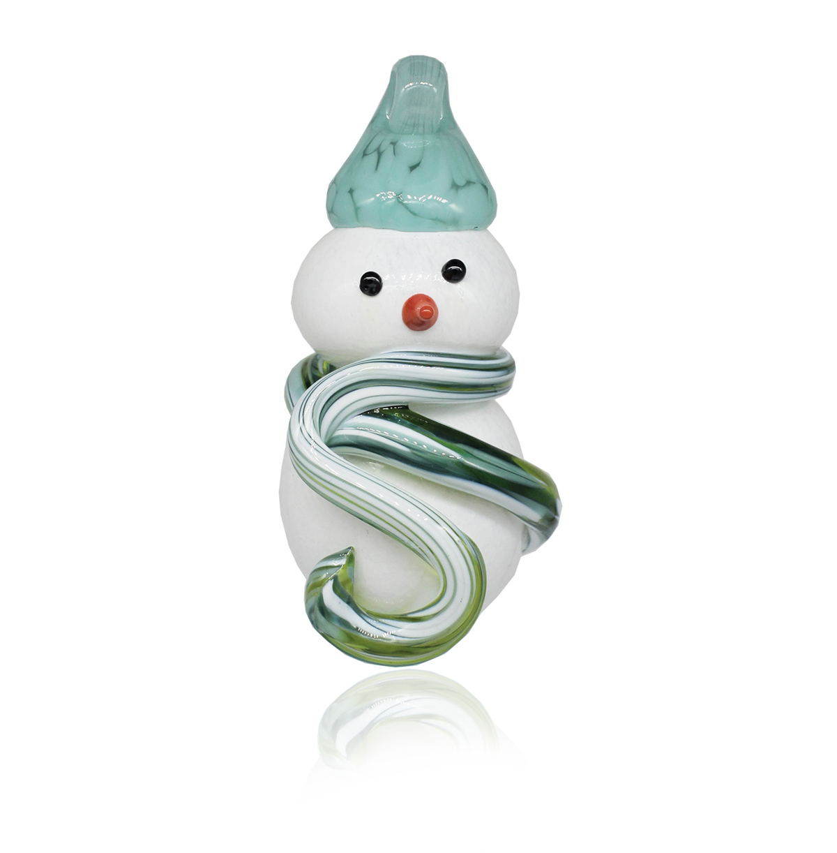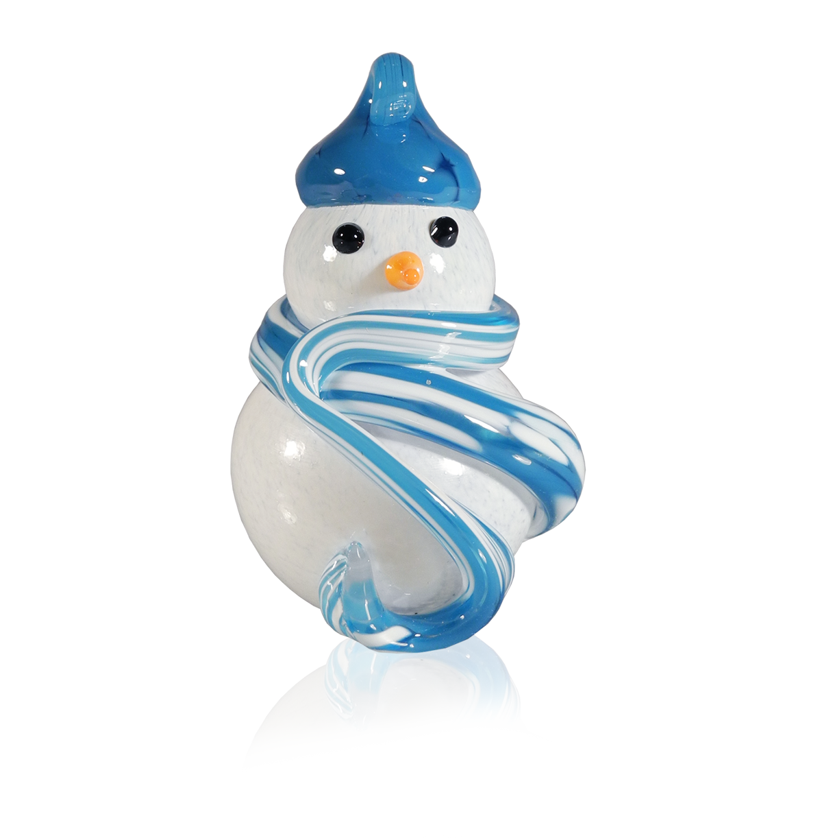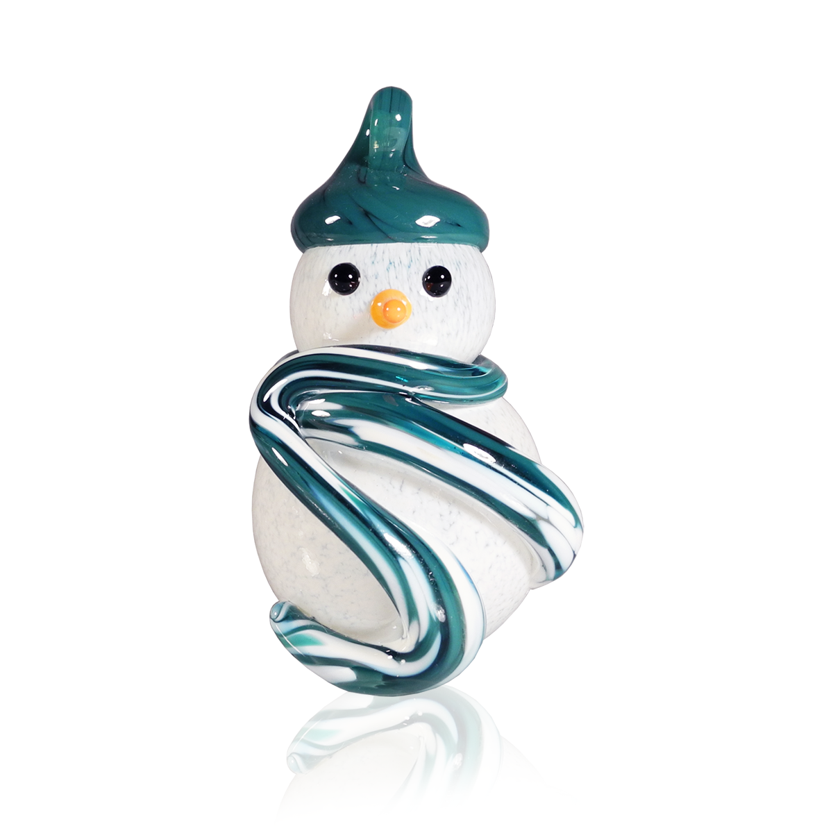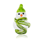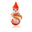 Crafting these delightful snowmen starts with blowing white glass into the iconic snowman shape. For the scarf, we add vibrant coloured bits of hot glass, giving each snowman its own unique personality. We then use black and orange glass rods, carefully melted and shaped, to form expressive eyes and a charming nose. Finally, a stylish hat is added to the snowman's head, complete with a looped hook, making it perfect for hanging and spreading holiday cheer.