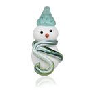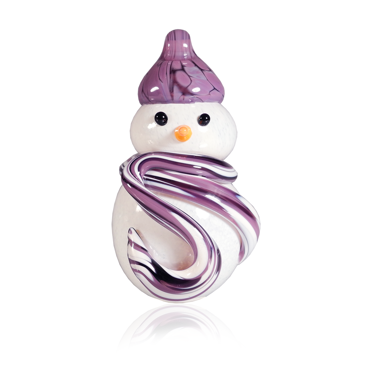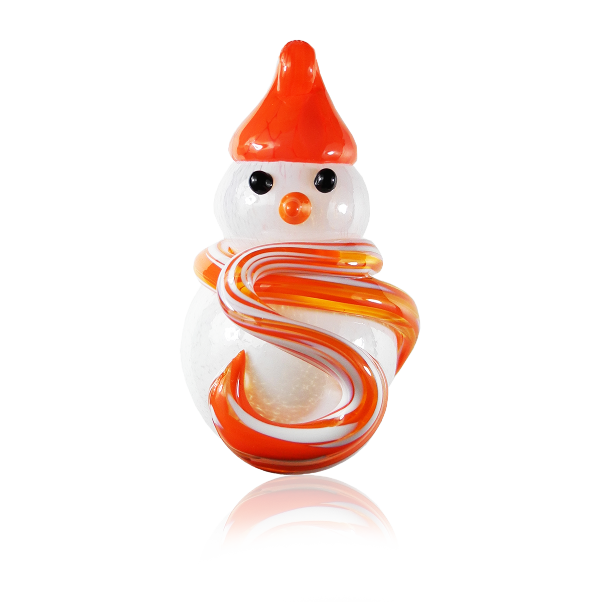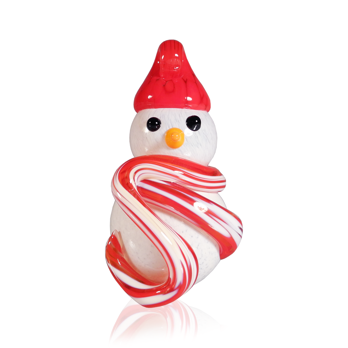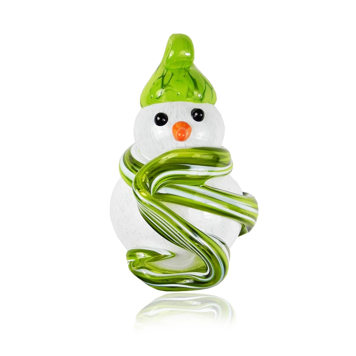 Crafting these delightful snowmen starts with blowing white glass into the iconic snowman shape. For the scarf, we add vibrant coloured bits of hot glass, giving each snowman its own unique personality. We then use black and orange glass rods, carefully melted and shaped, to form expressive eyes and a charming nose. Finally, a stylish hat is added to the snowman's head, complete with a looped hook, making it perfect for hanging and spreading holiday cheer.