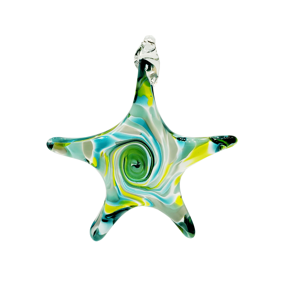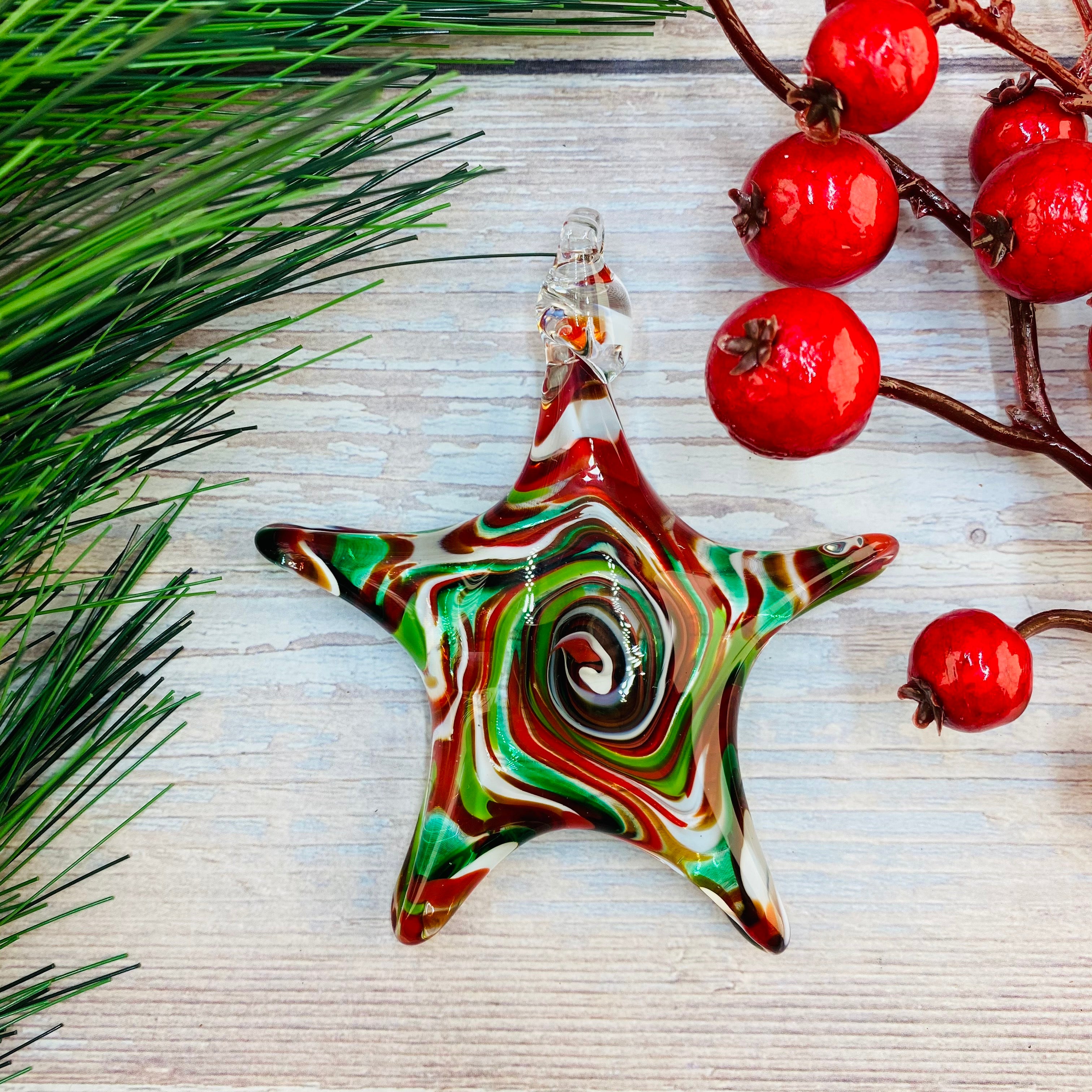 These bright, hand-sculpted glass stars burst with holiday cheer. Perfect for the Christmas tree! Each one begins in the fiery heart of our hot shop, where we gather molten glass from the furnace, glowing at 2100°F. We swirl in a splash of colour, give it a magical twist at the centre, and then carefully, one by one, we pull each point of the star by hand. When the shape is just right, we torch it and add a loop so it’s ready to twinkle on the tree. Each star is a little different, a little fiery, and handmade with love.